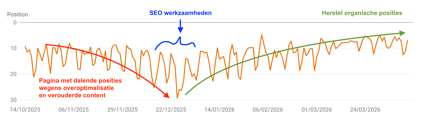 Afhankelijk van de staat van jouw website en mijn analyse hiervan, stel ik voor om pagina’s te updaten, de autoriteit te verhogen of om eerst de gehele website te laten optimaliseren.